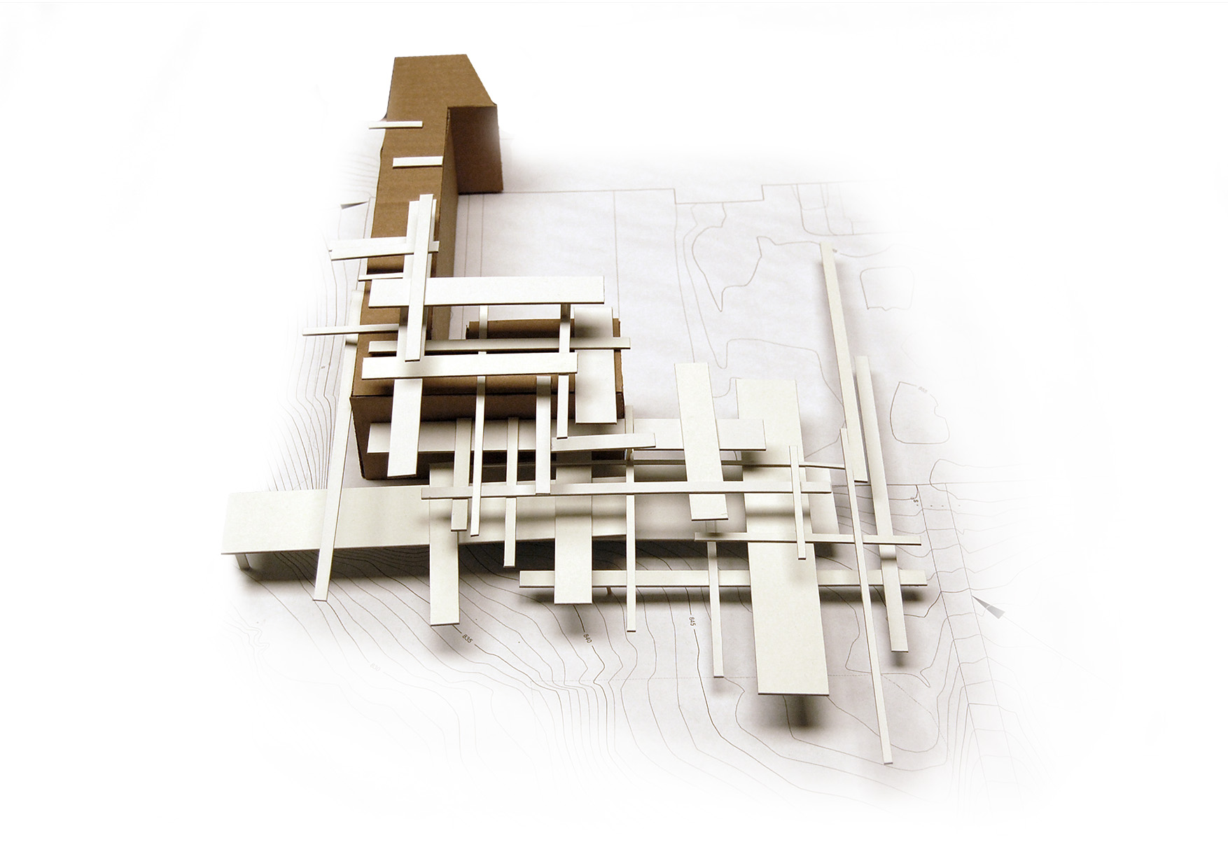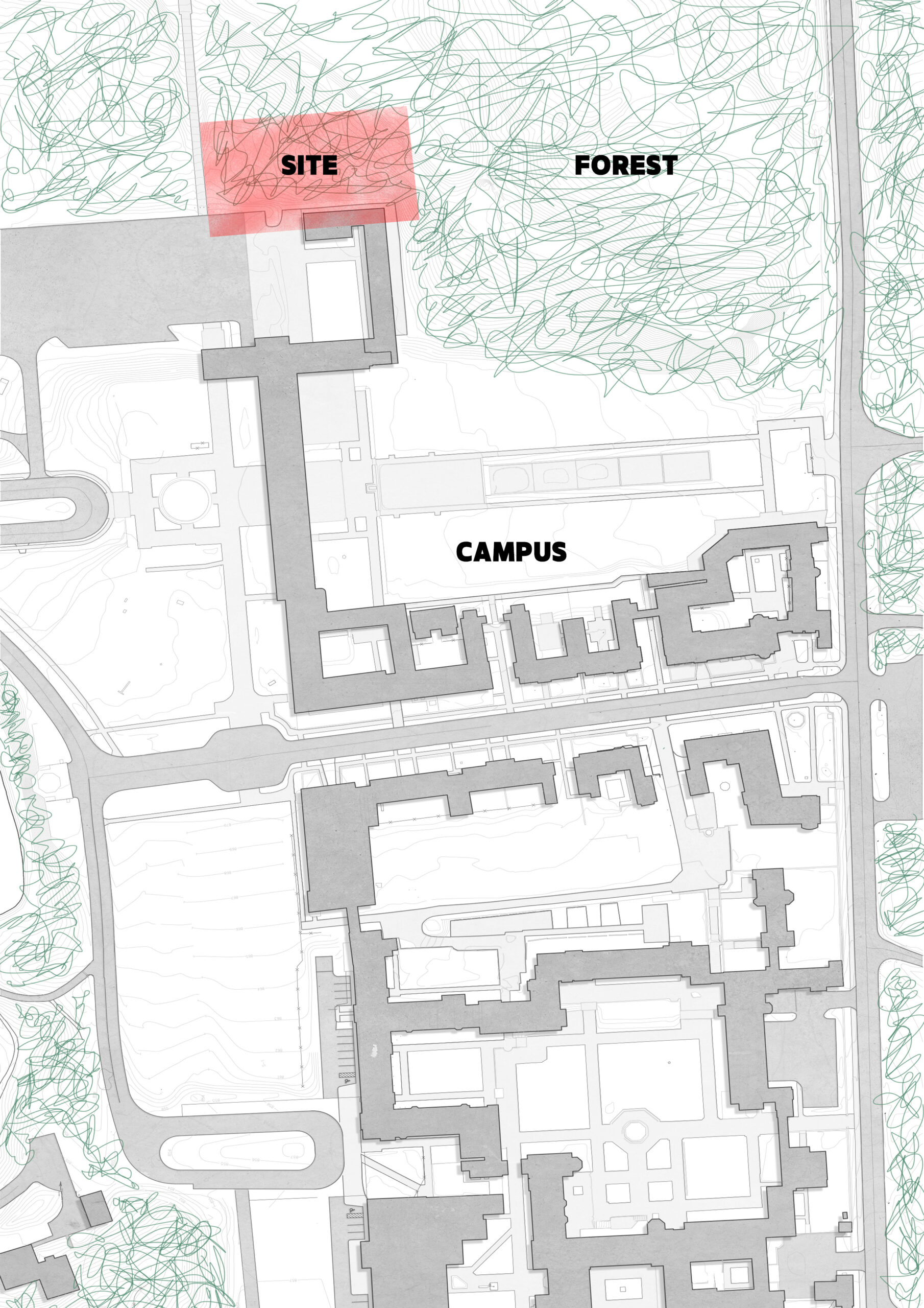 The project takes its architectural strategy from this condition. Where the campus presents a pixelated field of rectangular buildings, the Wellness Center imagines these volumes dissolving as they approach the forest. The grid depixelates into a finer grain — buildings fragment, multiply, and overlap, becoming porous and irregular as they blend with the woodland. Architecture here is not a singular form but a constellation, a landscape of built elements that appear to grow outward from the order of the campus into the complexity of nature.