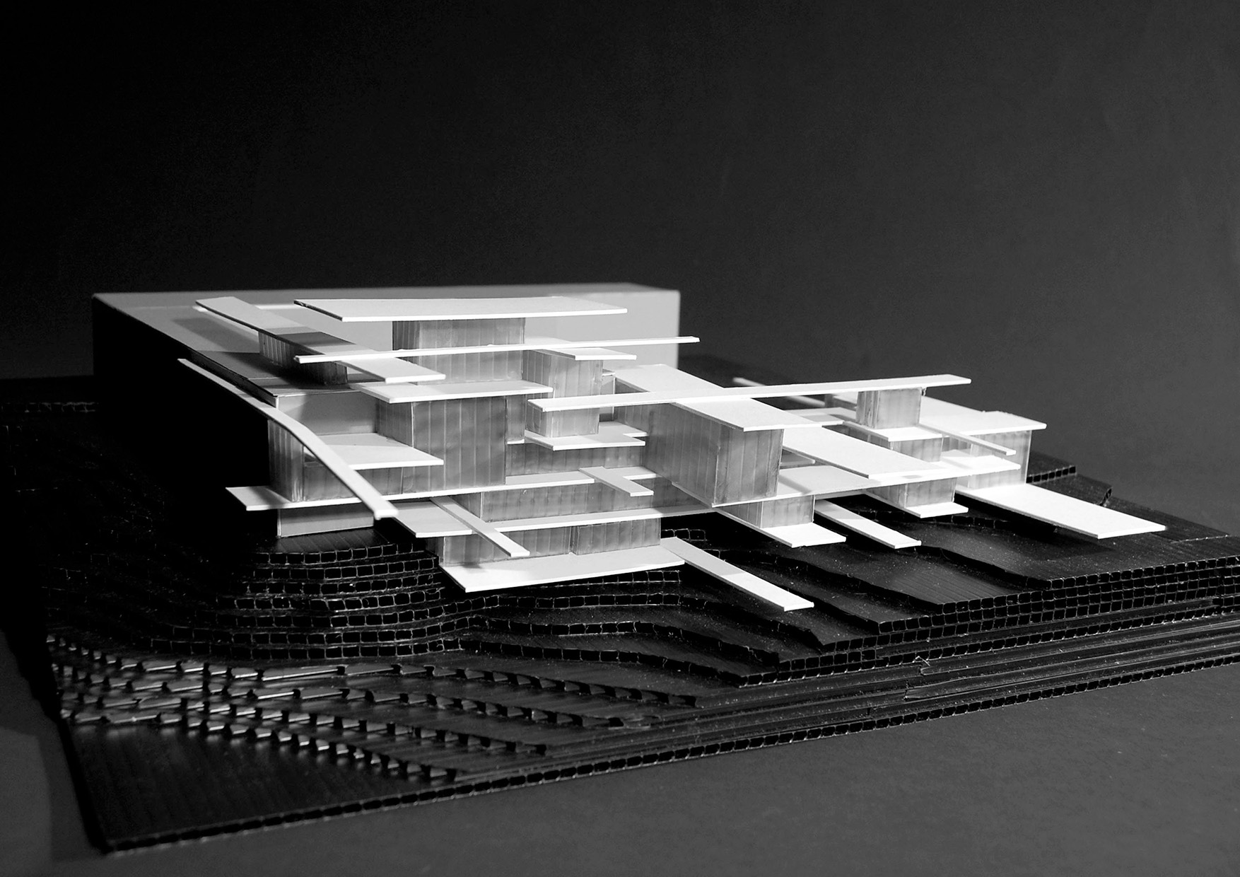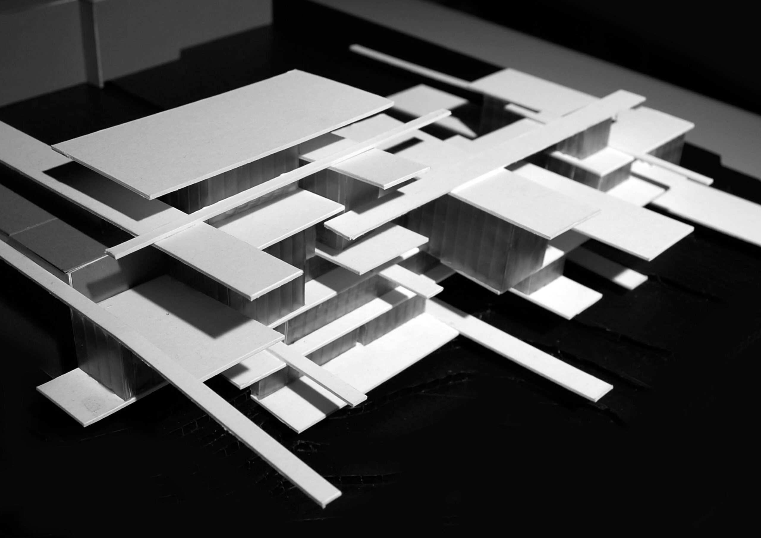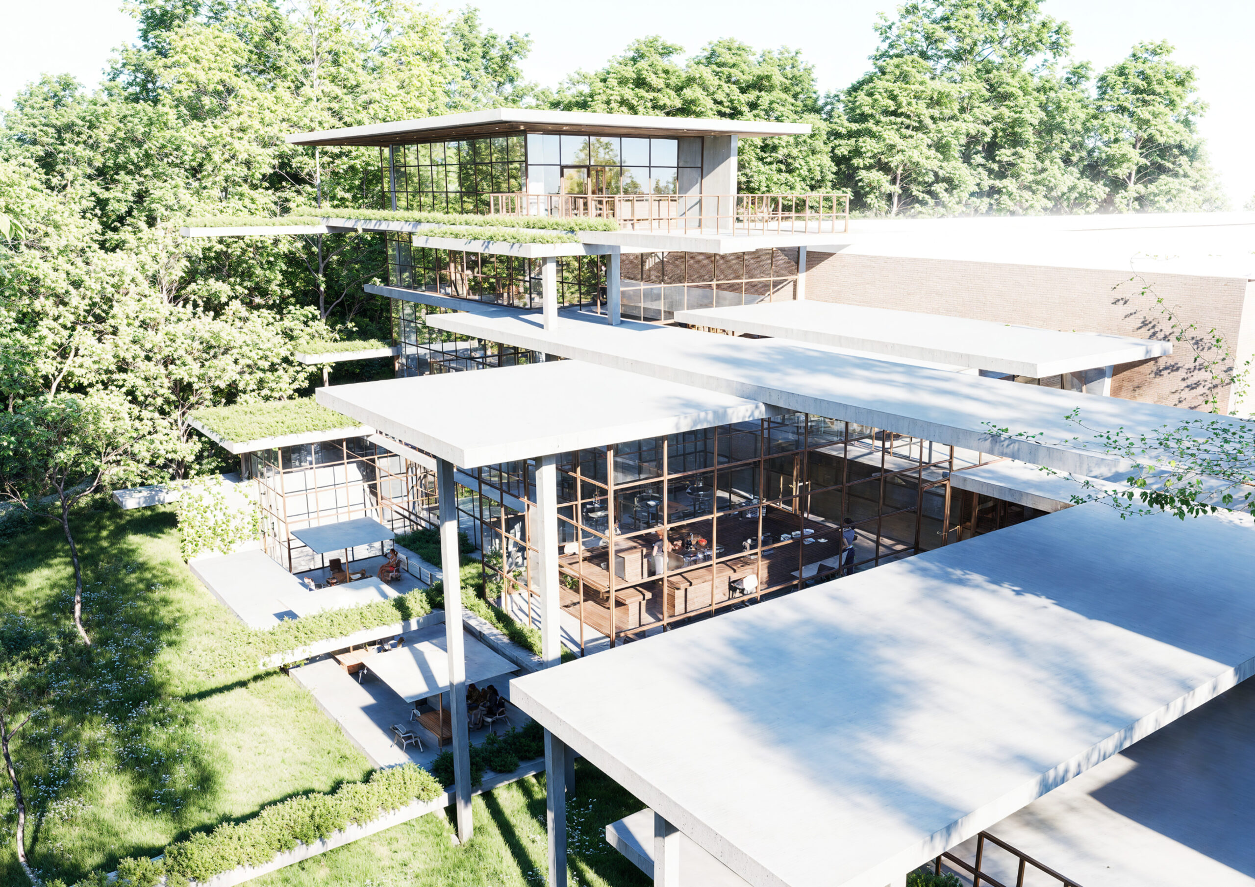 The idea of depixelation shapes the overall composition. Larger rectilinear volumes near the existing campus dissolve into smaller, staggered units as they extend toward the forest. This shift creates a rhythm of open and enclosed spaces and terraces, interior and exterior. Circulation paths dissipate through the composition, encouraging movement that feels exploratory rather than linear.