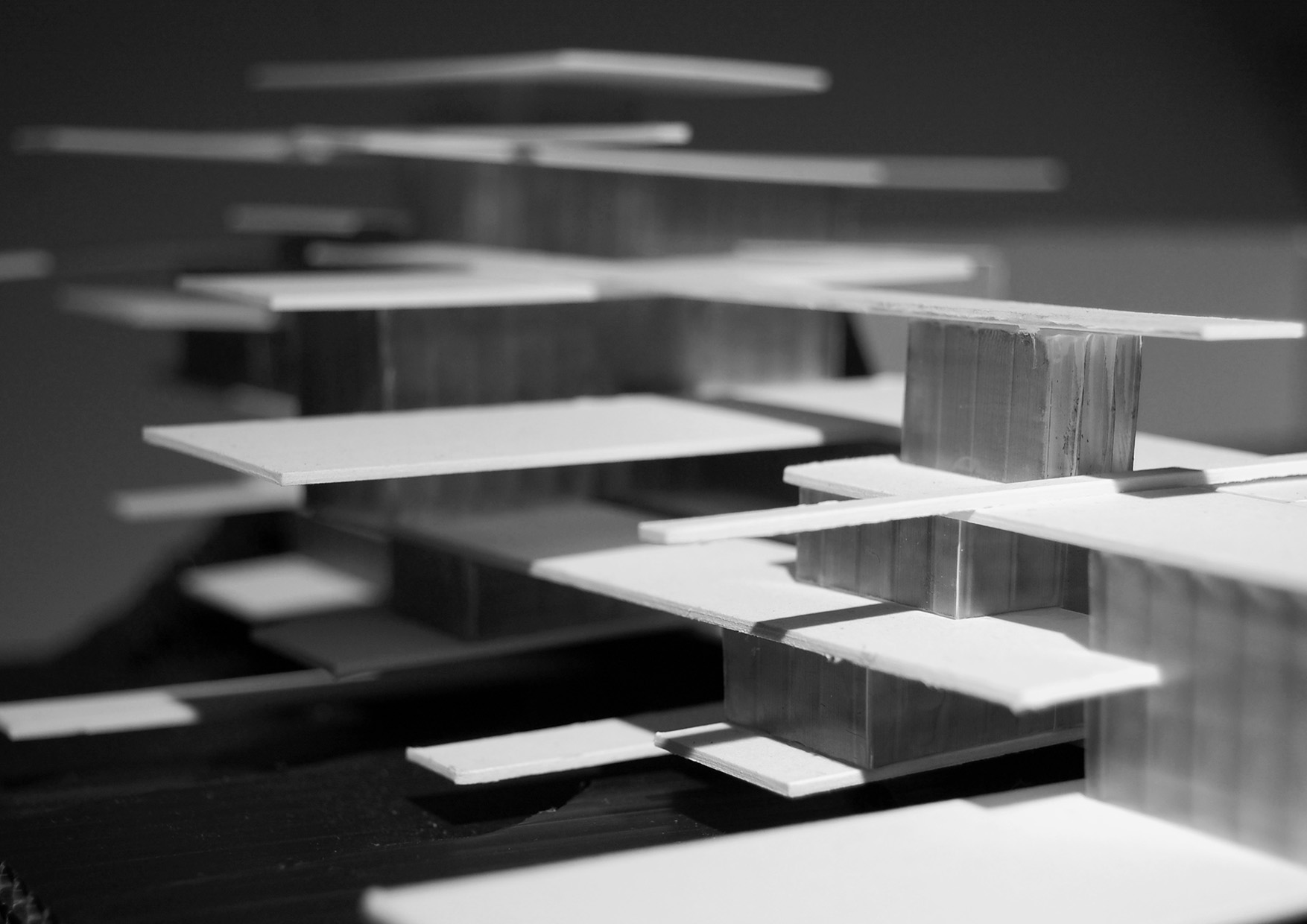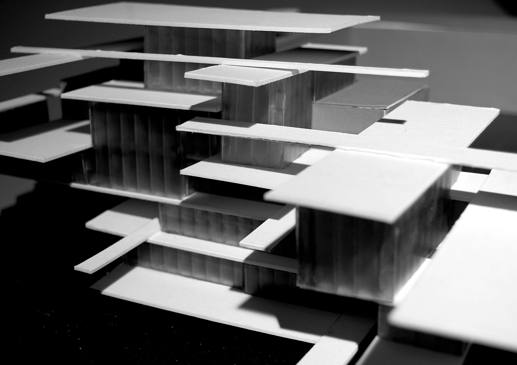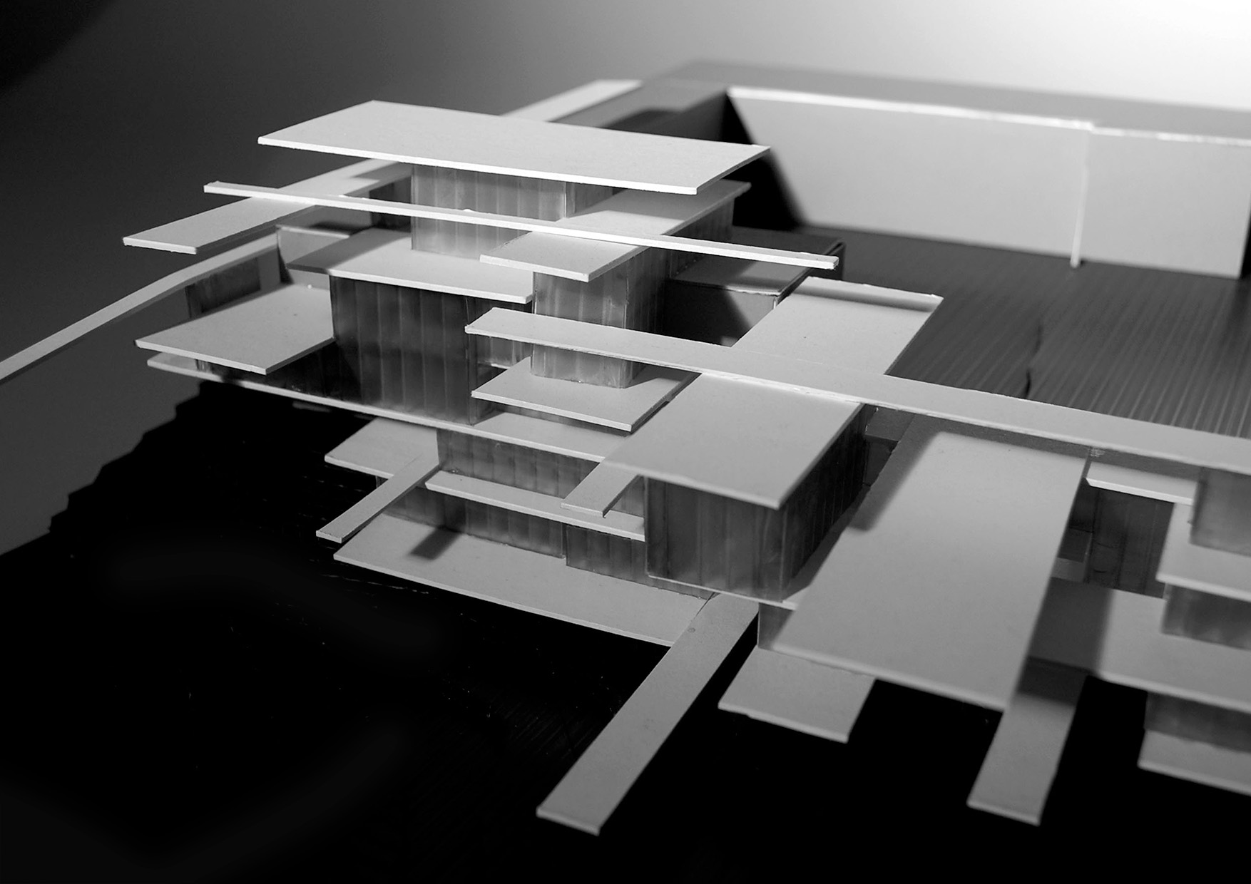 The idea of depixelation shapes the overall composition. Larger rectilinear volumes near the existing campus dissolve into smaller, staggered units as they extend toward the forest. This shift creates a rhythm of open and enclosed spaces and terraces, interior and exterior. Circulation paths dissipate through the composition, encouraging movement that feels exploratory rather than linear.