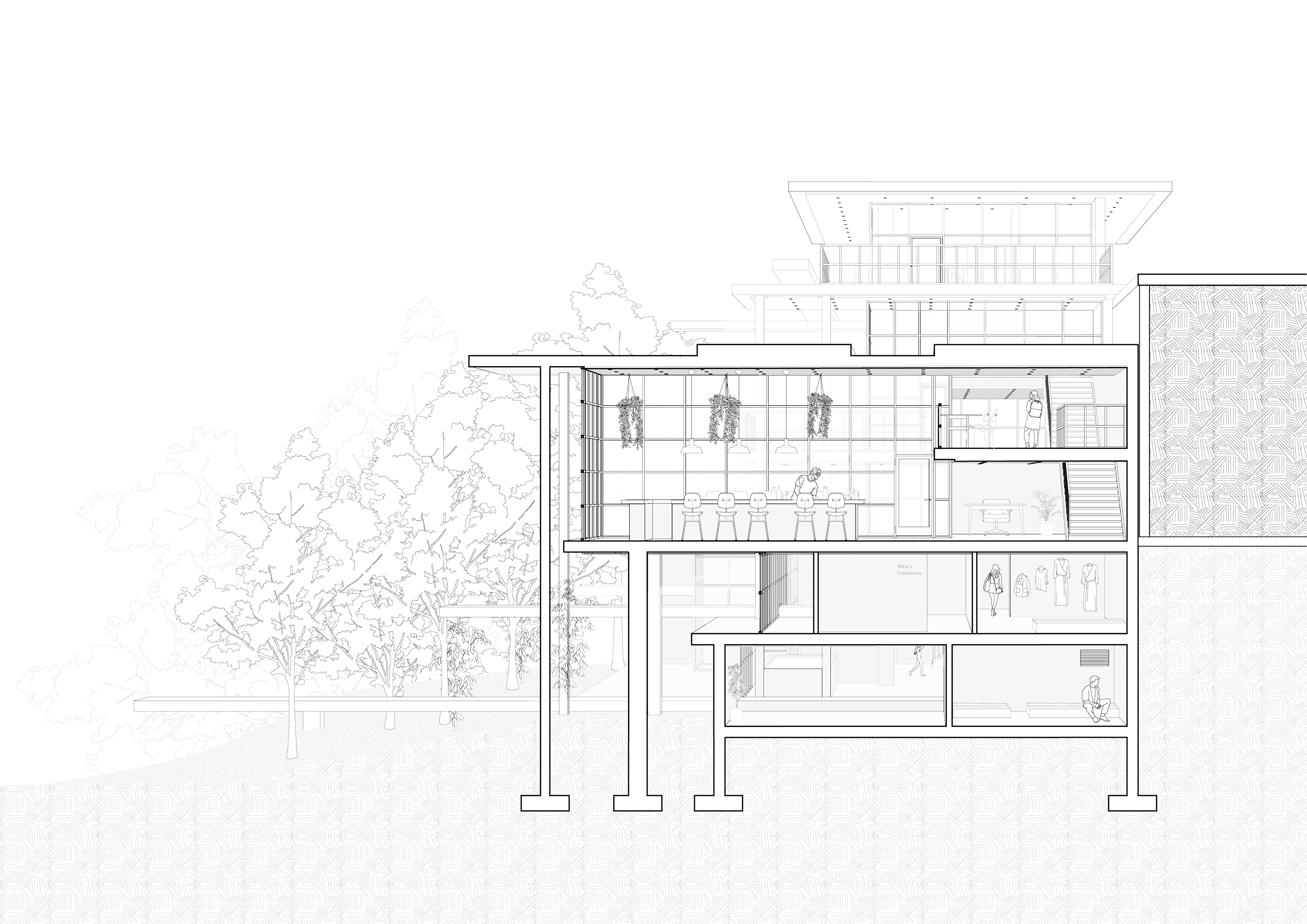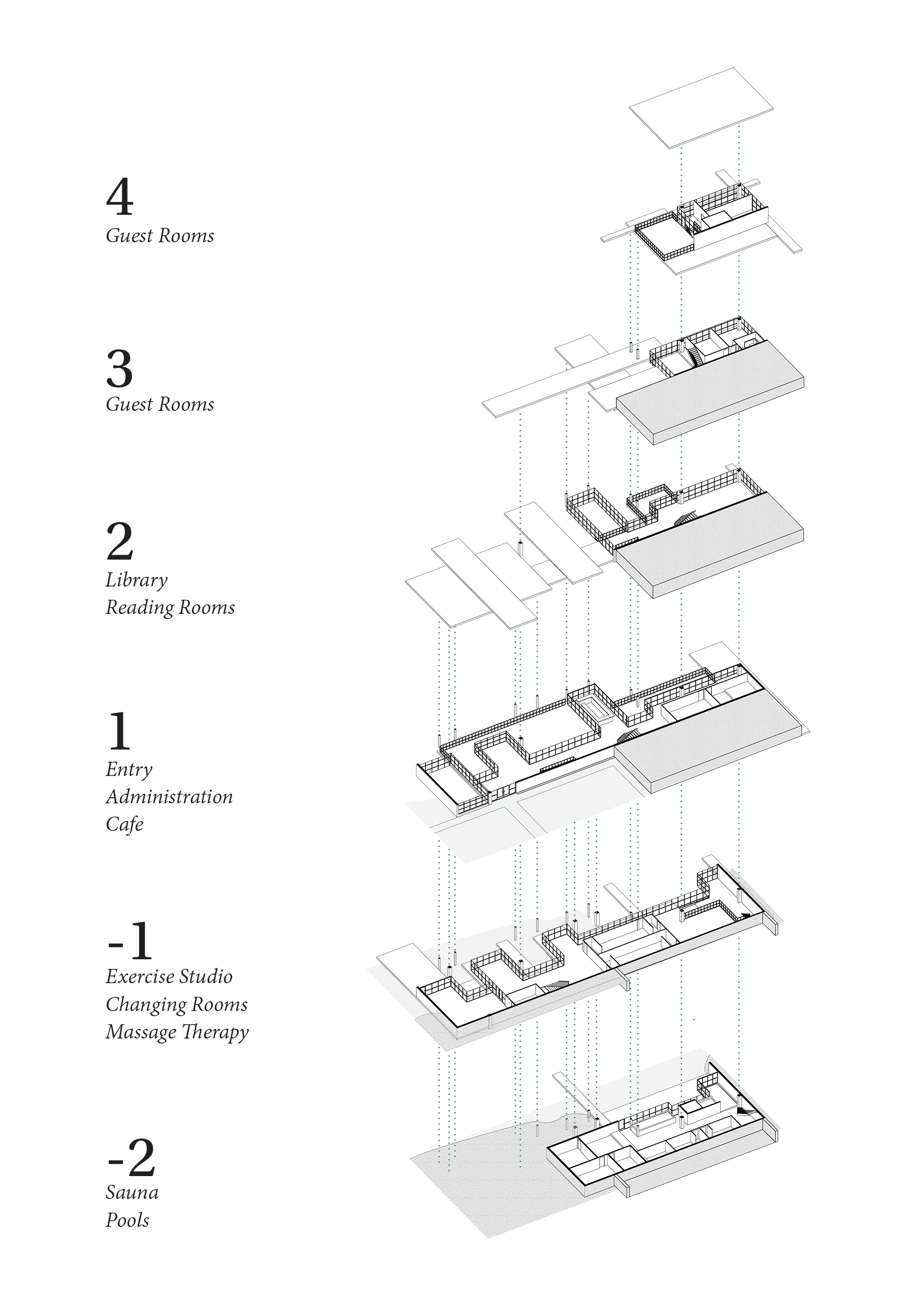 This strategy establishes the Wellness Center as a gradient of experiences. At the campus edge, spaces are more formal and collective: the library, café, and studios. Moving outward, the scale becomes more intimate: pools surrounded by greenery, secluded guest rooms, quiet alcoves for reflection. Architecture becomes progressively more porous until finally it dissolves into the trees.