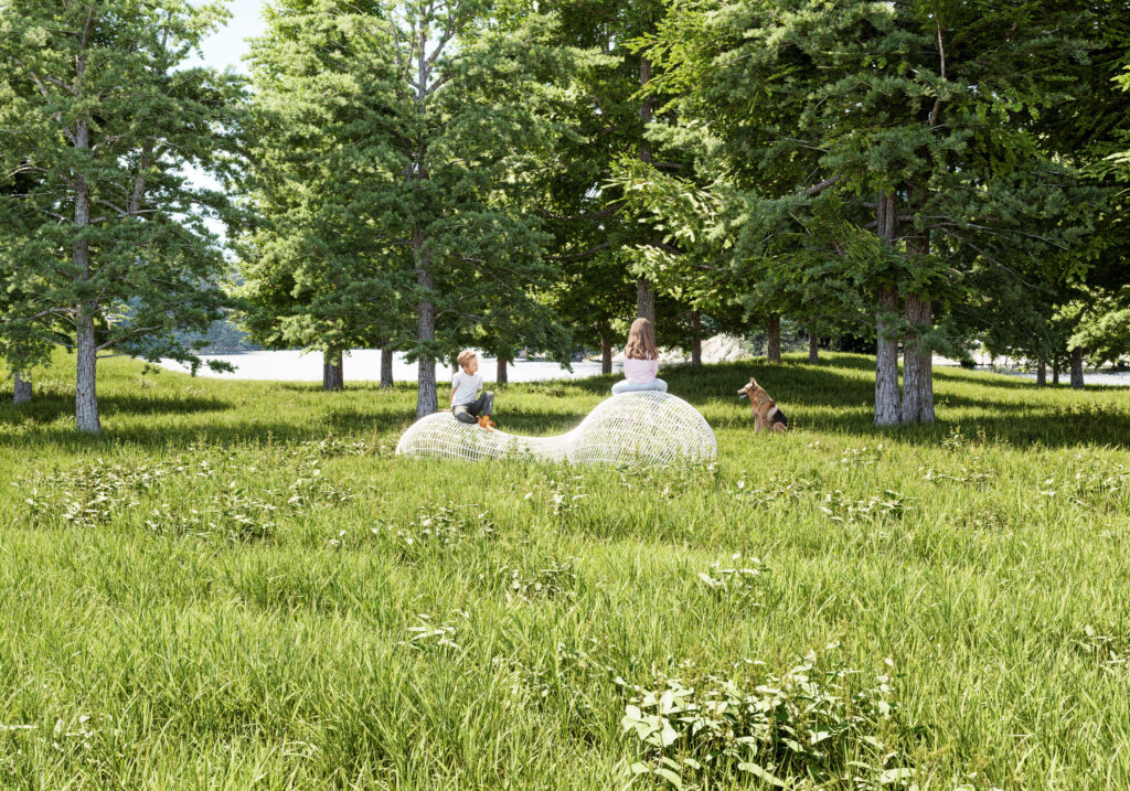 The Grandfather Chair comes from an exploration of how an object expresses history and use. Rather than deteriorating, the chair grows richer and more complex over time. Made of hollow mesh framework, the piece is intended as public, outdoor seating. The form aims to allow maximum seating choices and shield an interior planting space.