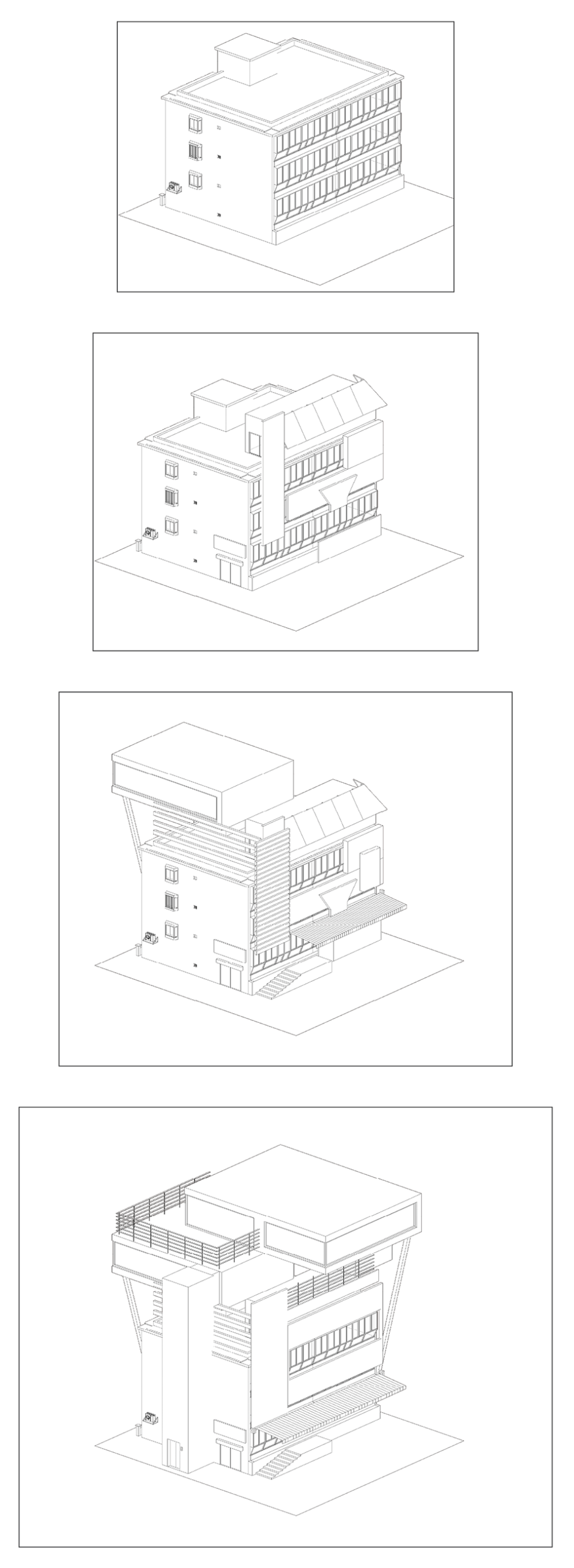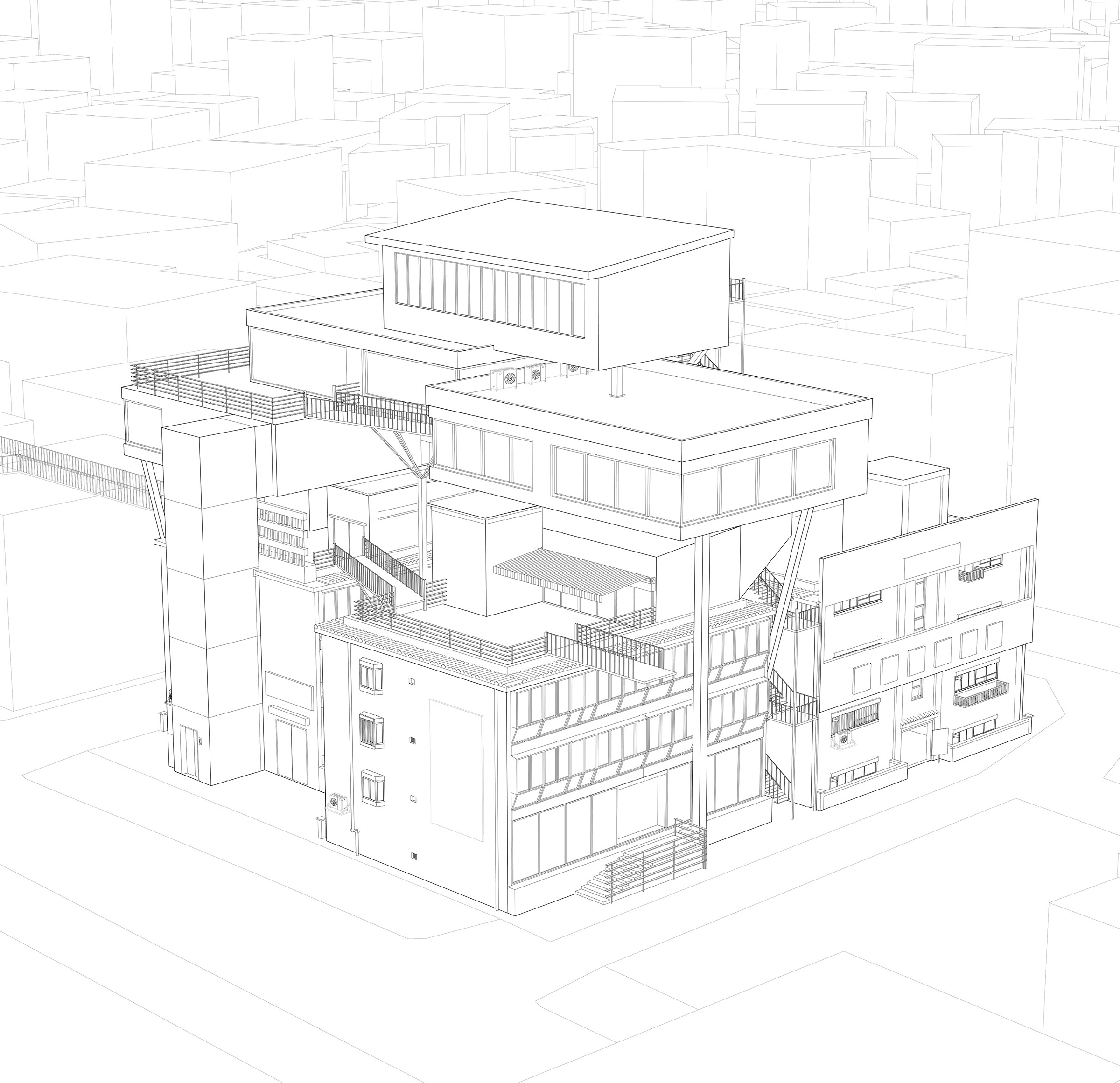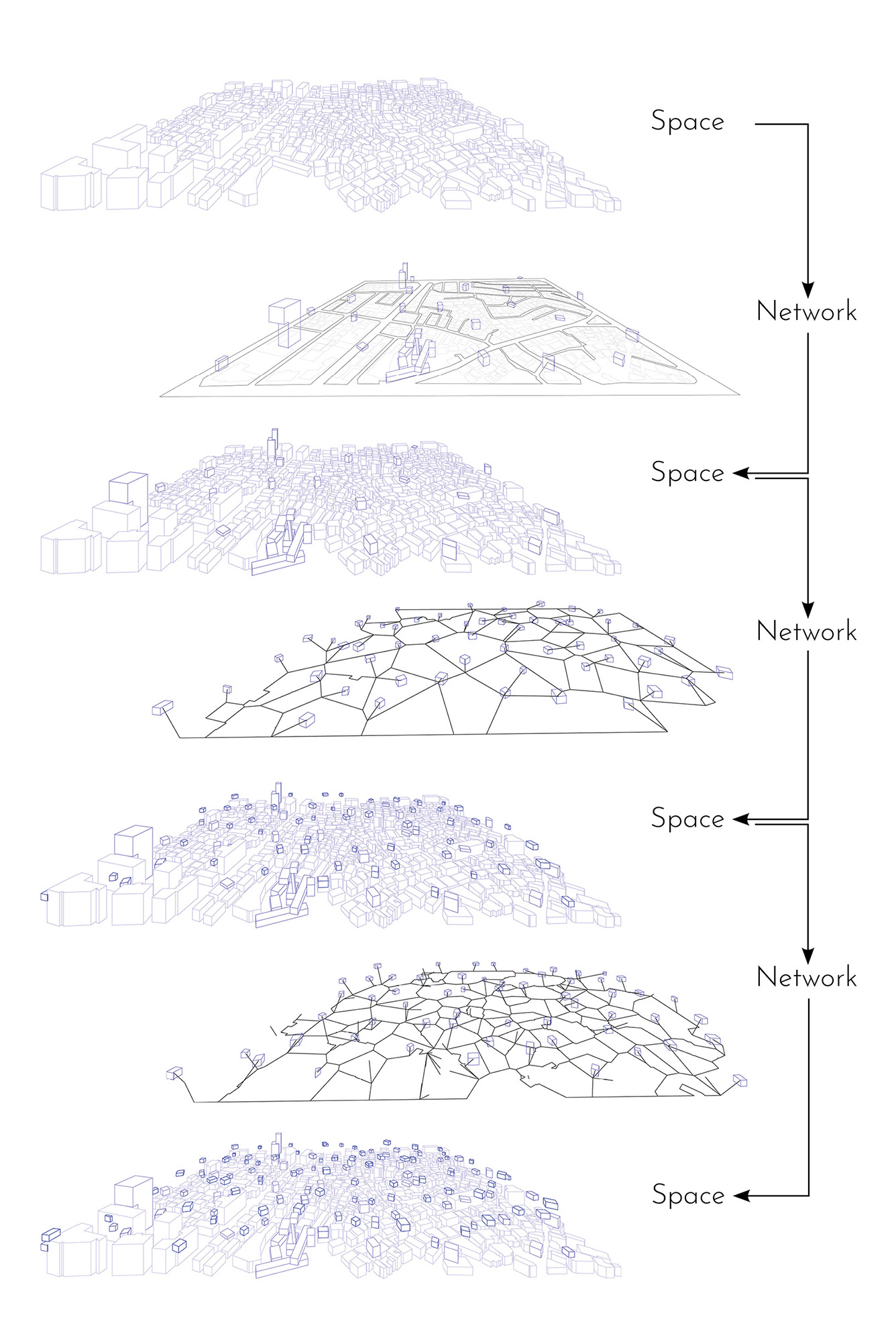 To test this framework, one potential phase of development was initiated. As buildings grew upward across property lines, load-bearing beams became prominent architectural elements, creating a visible structural language while allowing flexible space above. Circulation expanded into three dimensions. Pedestrian bridges connected upper levels, stairs wove between buildings, and the street grid expanded vertically, creating multiple layers of public passage. Rooftops became plazas, and gaps between structures provided light, air, and views.