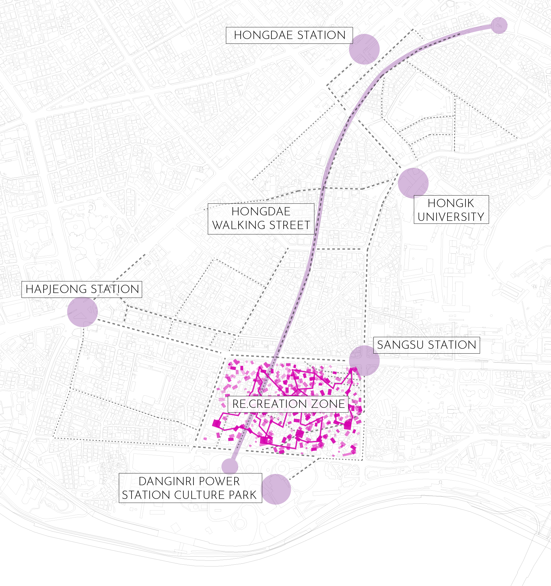 The Re.Creation Zone aims to establish a recreation (leisure) zone for Hongdae’s vibrant youth culture through a continuous recreation (creating anew) of spatial organization, land use, and urban aesthetics. Rather than treating complexity as inadequate planning, the framework recognizes layered environments as valuable in themselves. The visual richness of accumulated façades, the spatial discovery of irregular circulation, the social mixing of varied commercial scales – these emerge from incremental change, not comprehensive design.