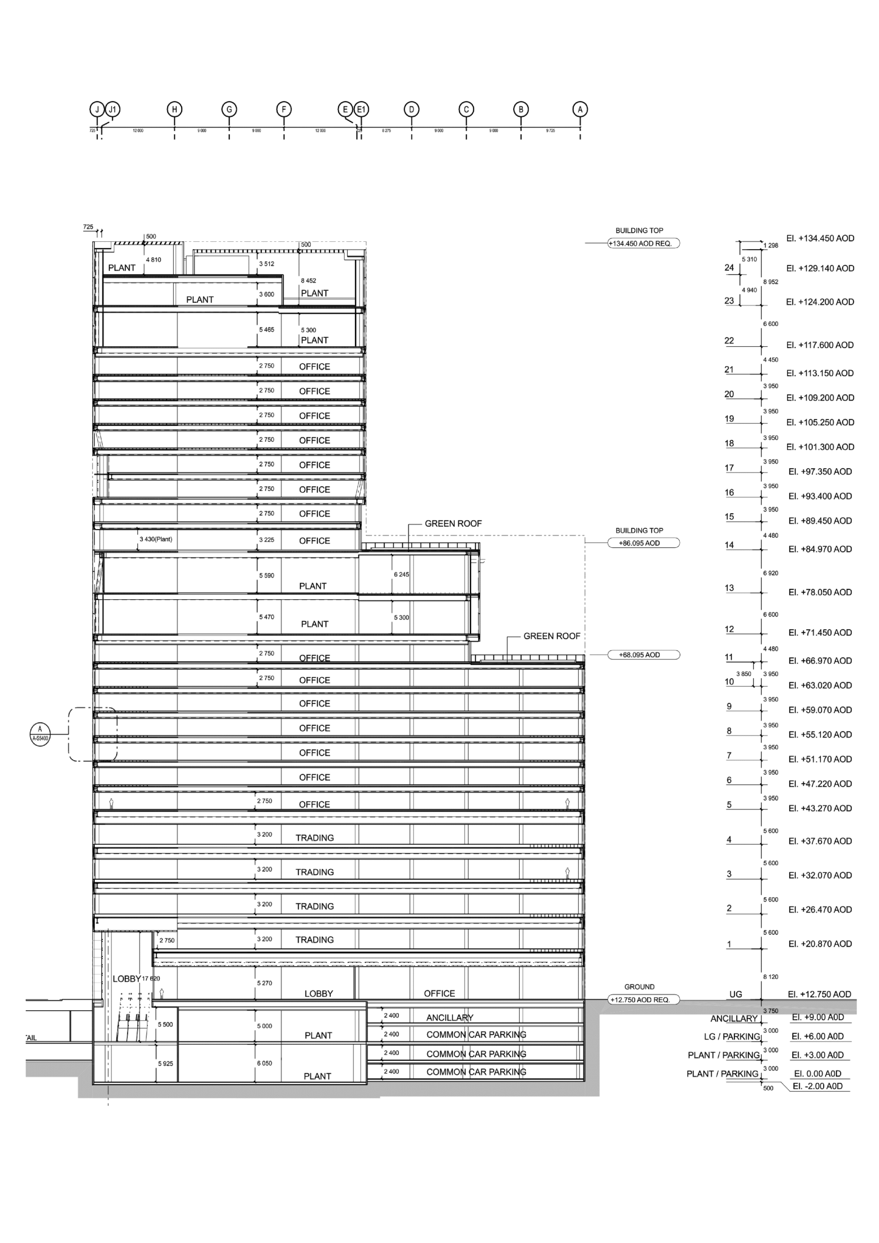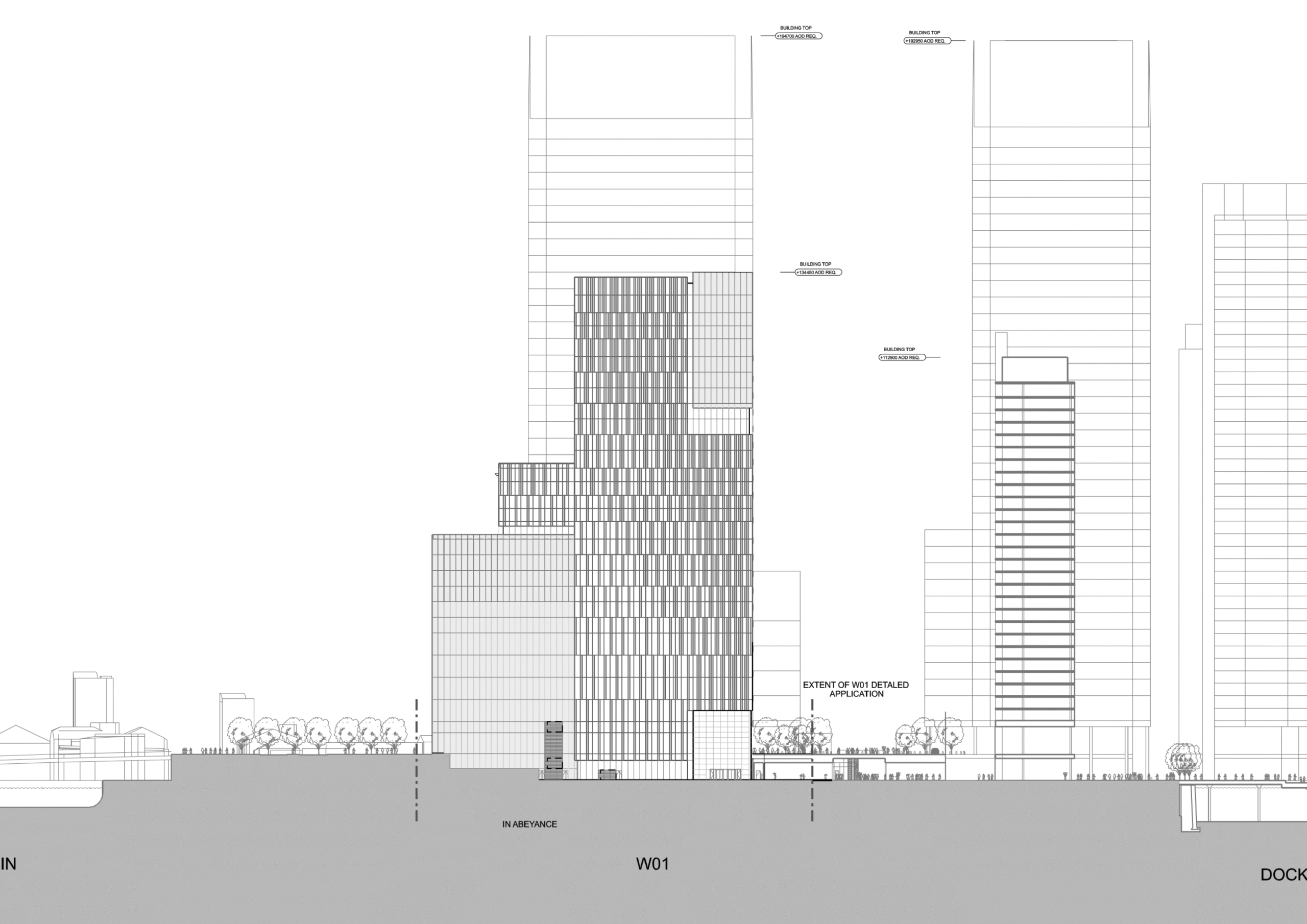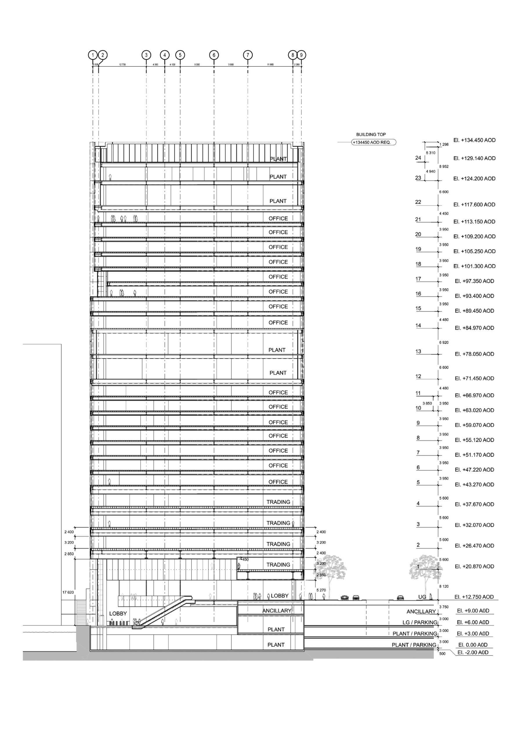 The Wood Wharf Tower forms part of the new business district adjacent to Canary Wharf in London, masterplanned by Richard Rogers Partnership. Designed as a primary gateway to the development, the building combines large trading floors, flexible office space, and multiple plant levels within a total area of approximately 133,000 m². The tower’s stepped profile and integrated green roofs address the site’s riverside context while maintaining efficient floorplates for commercial use.